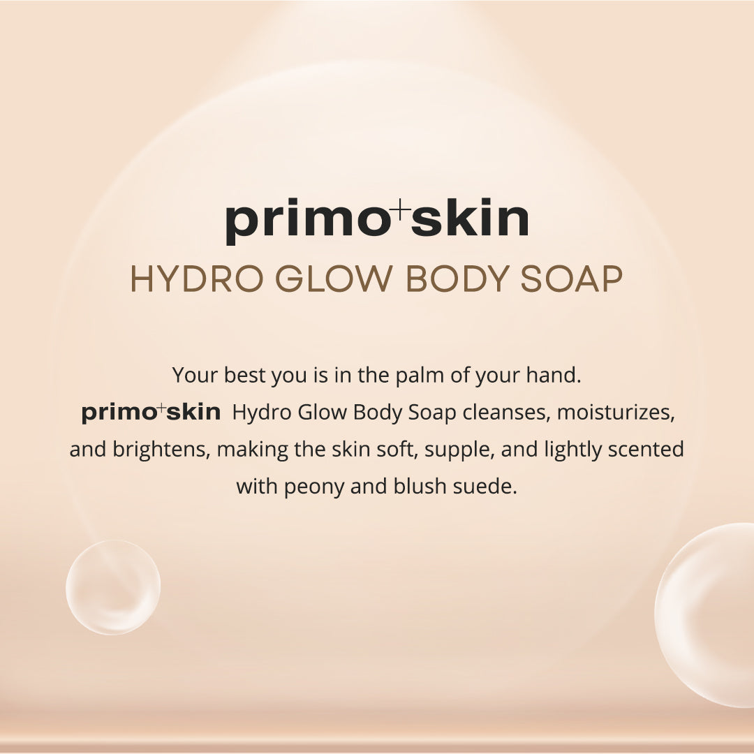 Your best you is in the palm of your hand. Primo⁺Skin Hydro Glow Body Soap cleanses, moisturizes, and brightens, making the skin soft, supple, and lightly scented with peony and blush suede.